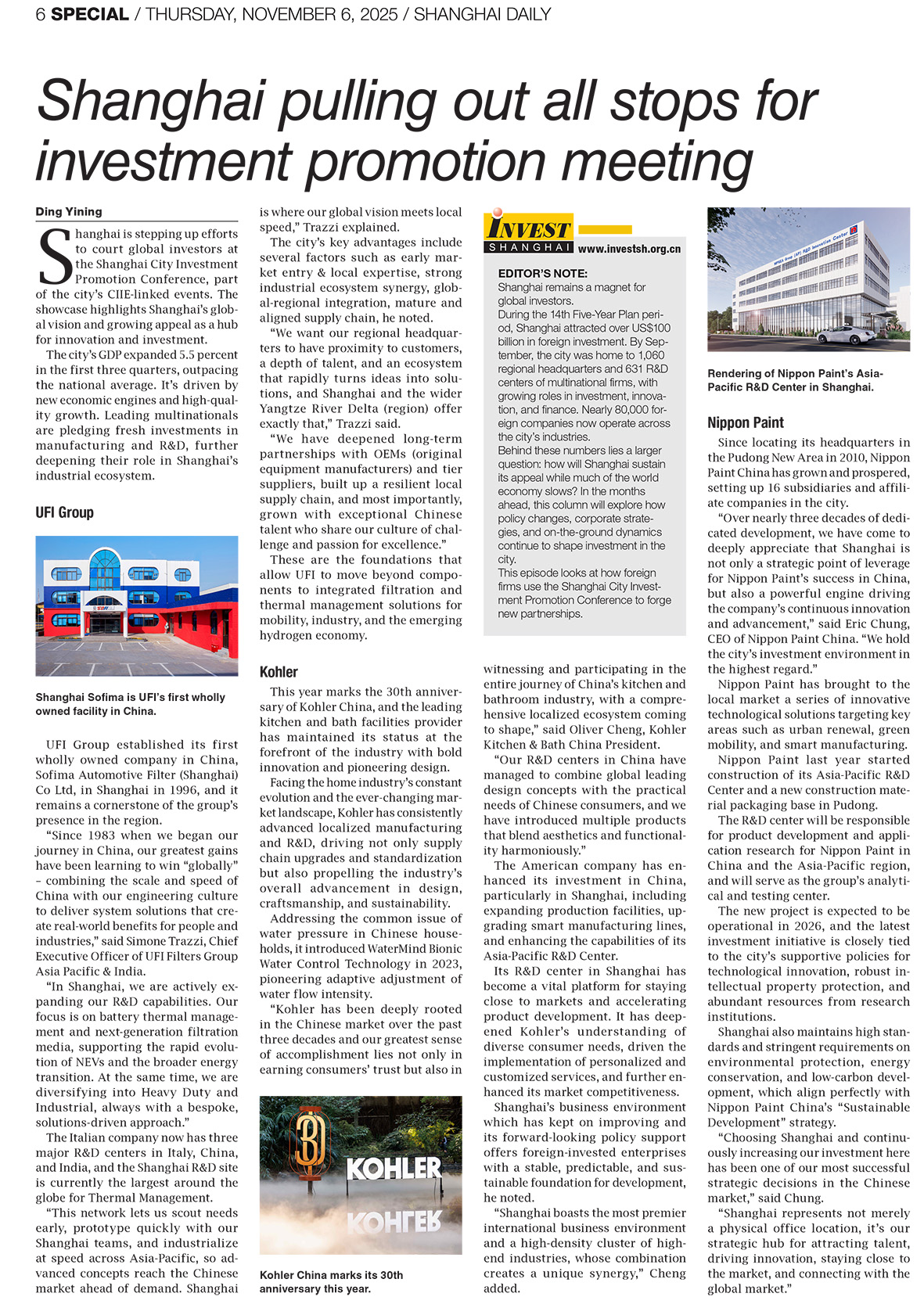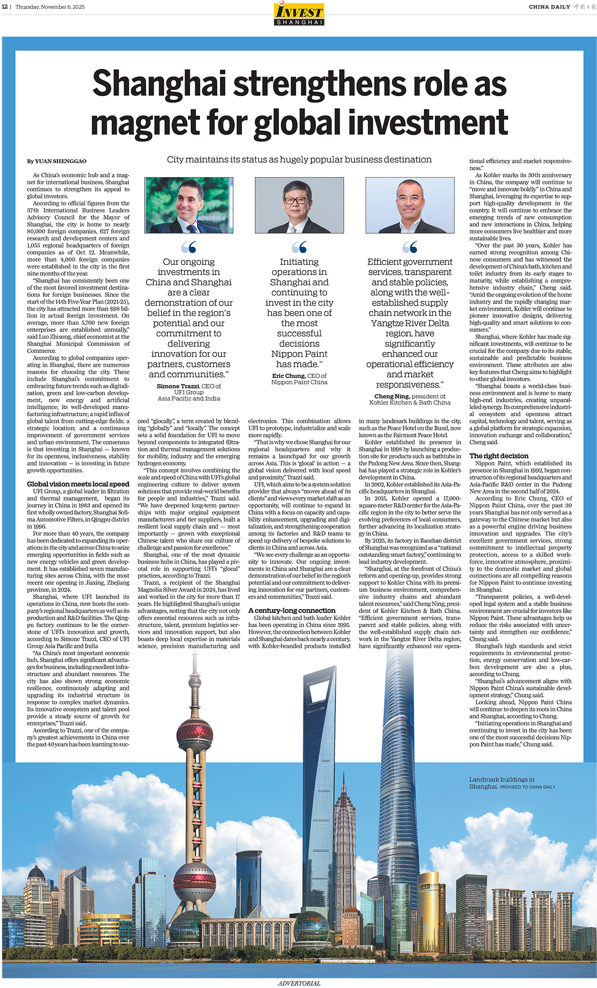 Dank dieser wichtigen Gelegenheit steht die UFI-Gruppe zusammen mit zwei weiteren bedeutenden multinationalen Unternehmen im Mittelpunkt zweier renommierter chinesischer Zeitungen, Shanghai Daily und China Daily, die der Erfolgsgeschichte und dem innovativen Engagement des Unternehmens im wirtschaftlichen Zentrum Chinas, Shanghai, viel Raum gewidmet haben.